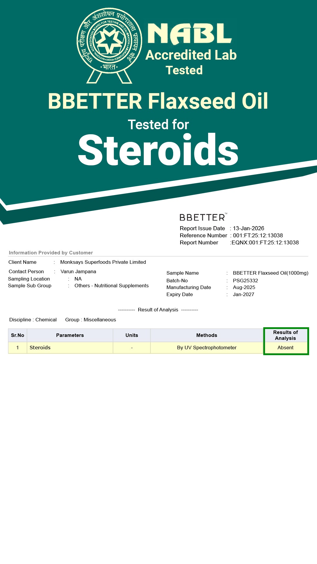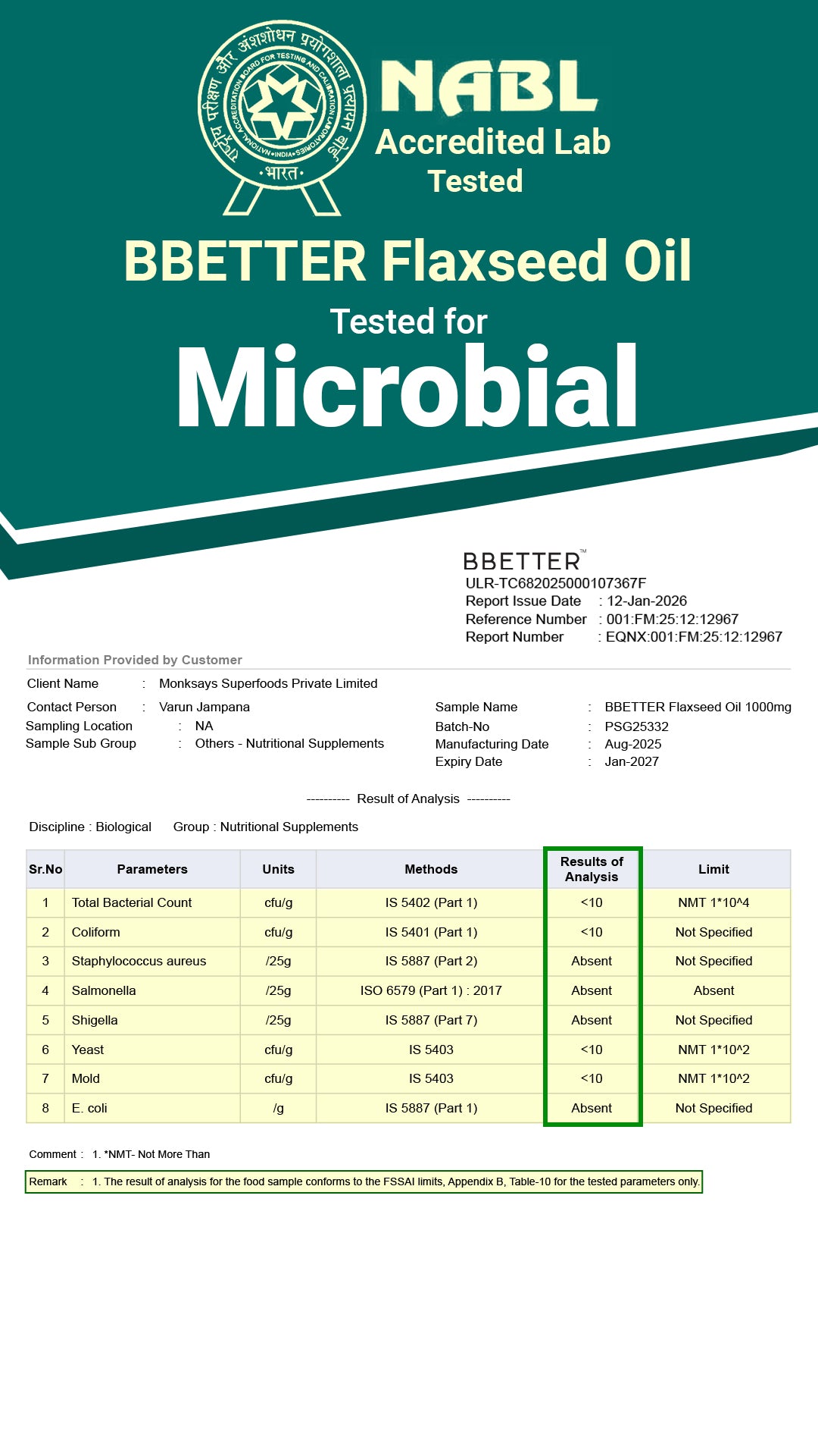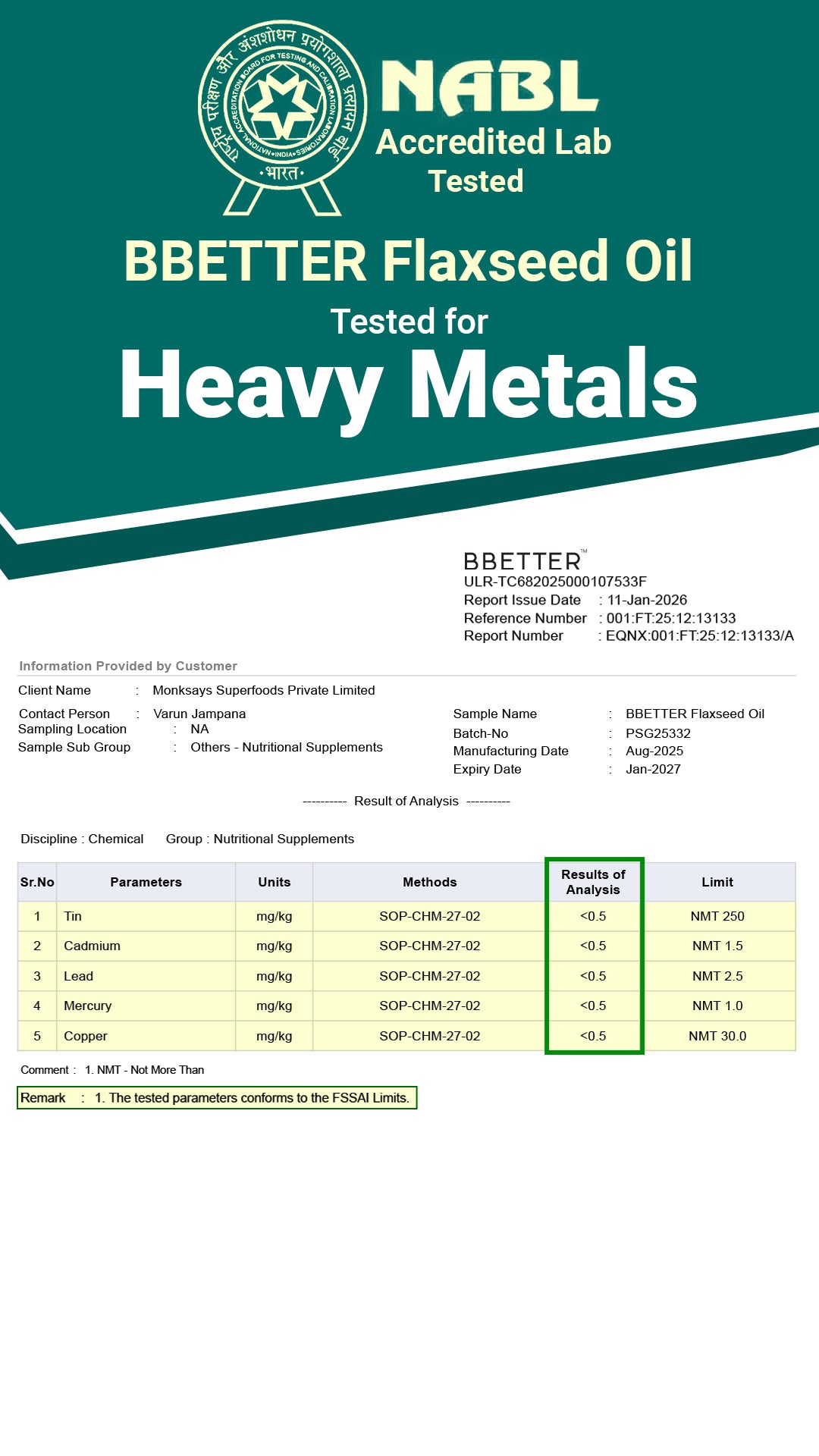 | Omega 3 Fatty Acids (Alpha Linolenic acid) | 500 mg |
